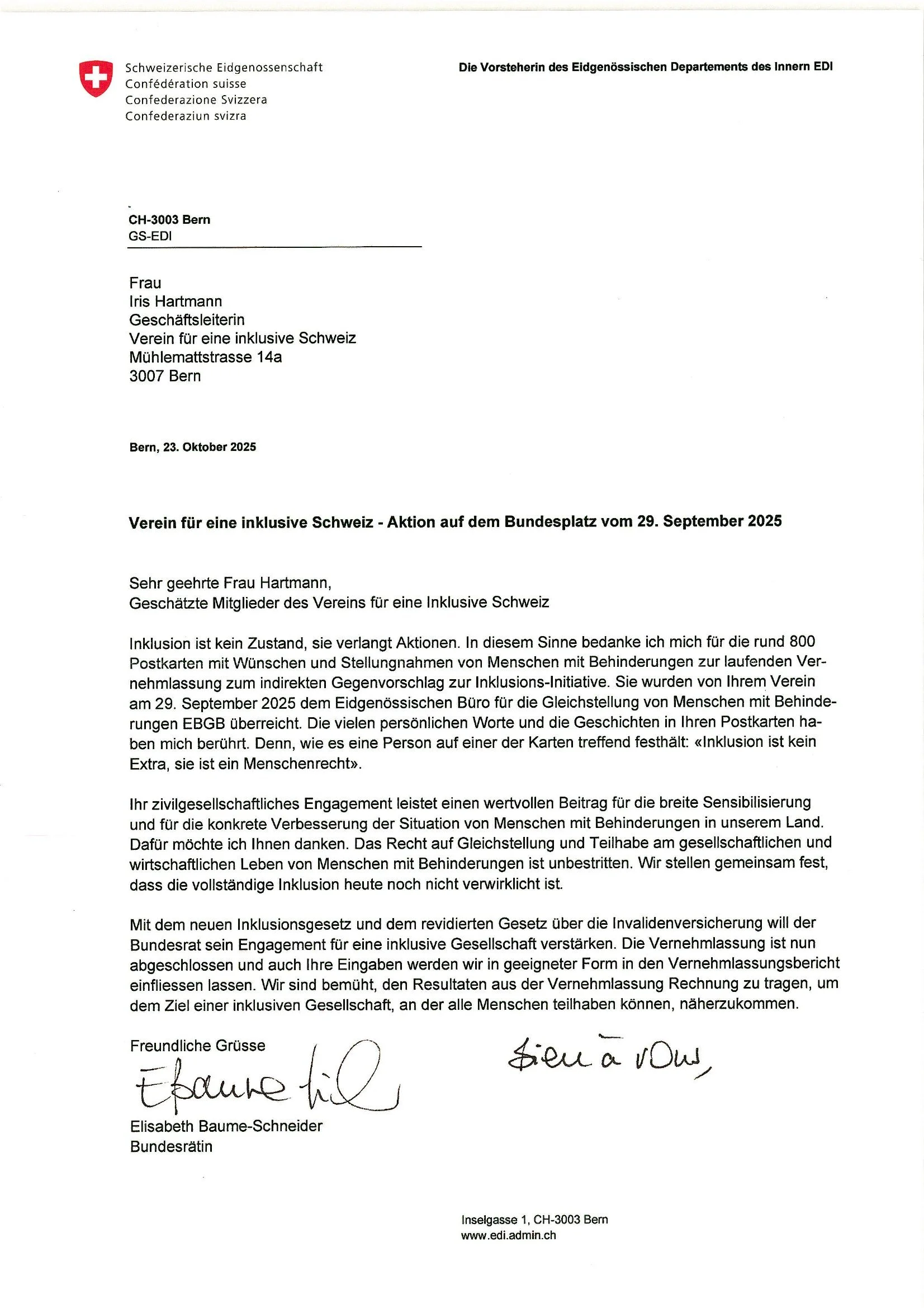 Inklusion ist kein Zustand, sie verlangt Aktionen. In diesem Sinne bedanke ich mich für die rund 800 Postkarten mit Wünschen und Stellungnahmen von Menschen mit Behinderungen zur laufenden Vernehmlassung zum indirekten Gegenvorschlag zur Inklusions-Initiative. Sie wurden von Ihrem Verein am 29. September 2025 dem Eidgenössischen Büro für die Gleichstellung von Menschen mit Behinde rungen EBGB überreicht. Die vielen persönlichen Worte und die Geschichten in Ihren Postkarten ha ben mich berührt. Denn, wie es eine Person auf einer der Karten treffend festhält: «Inklusion ist kein Extra, sie ist ein Menschenrecht».